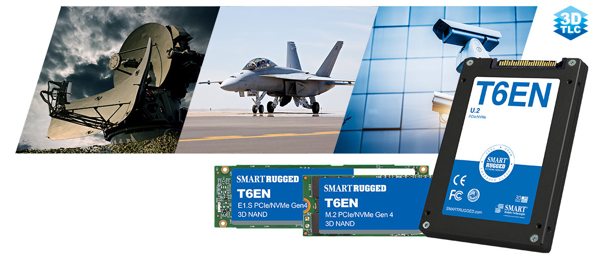 SMARTs T6EN PCIe/NVMe Gen4x4 RUGGED™ SSDs bieten Hochleistungsspeicherlösungen mit hoher Kapazität, die speziell für Verteidigung, Luft- und Raumfahrt sowie andere Anwendungen optimiert sind, die langlebigen, robusten und sicheren Speicher erfordern. Angetrieben von einem flexiblen, benutzerdefinierten Flash-Controller bieten die T6EN SSDs eine anhaltende Lese-/Schreibleistung, die nicht nur den Anforderungen von Hochdurchsatzanwendungen wie Flugdatenschreibern und Sensordatenerfassung gerecht wird, sondern sich auch gut für hochzuverlässige Telemetrie-, Überwachungs- und unternehmenskritische Anwendungen eignet.